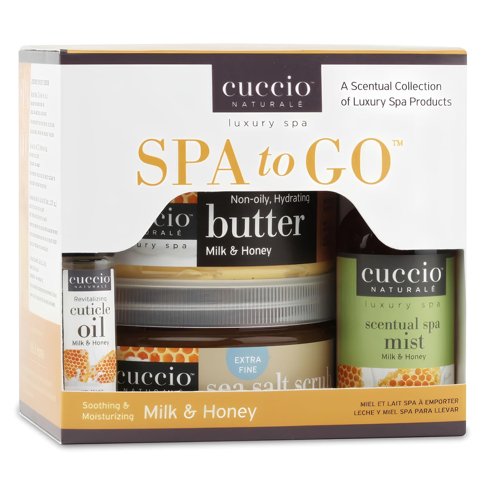Cuccio 4 Piece Spa To Go Kit – Milk & Honey – Nourishing Skincare Set for Hydration and Softening