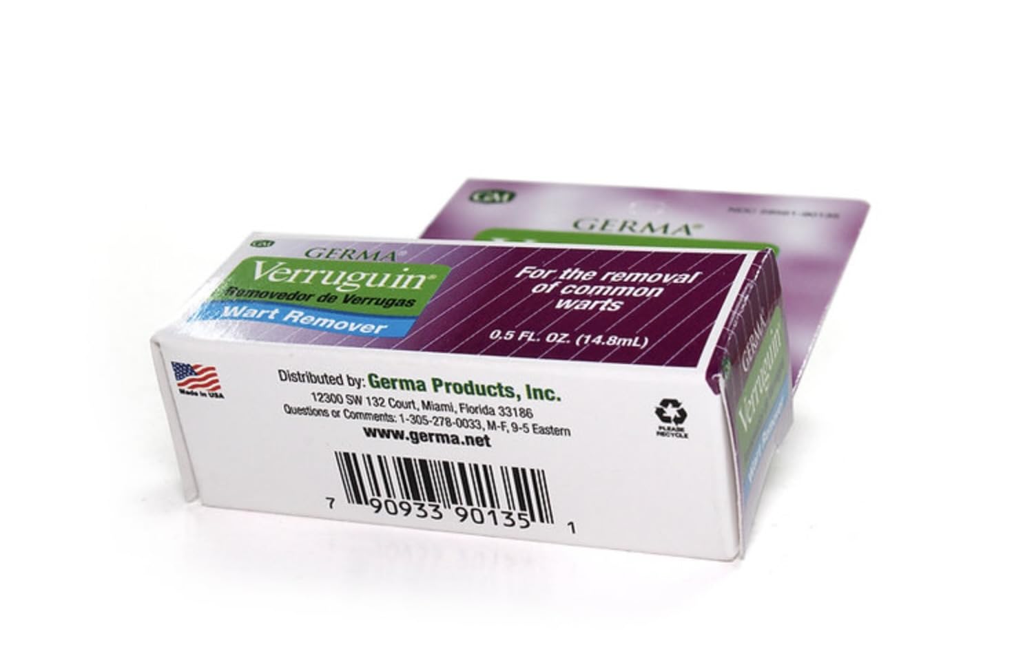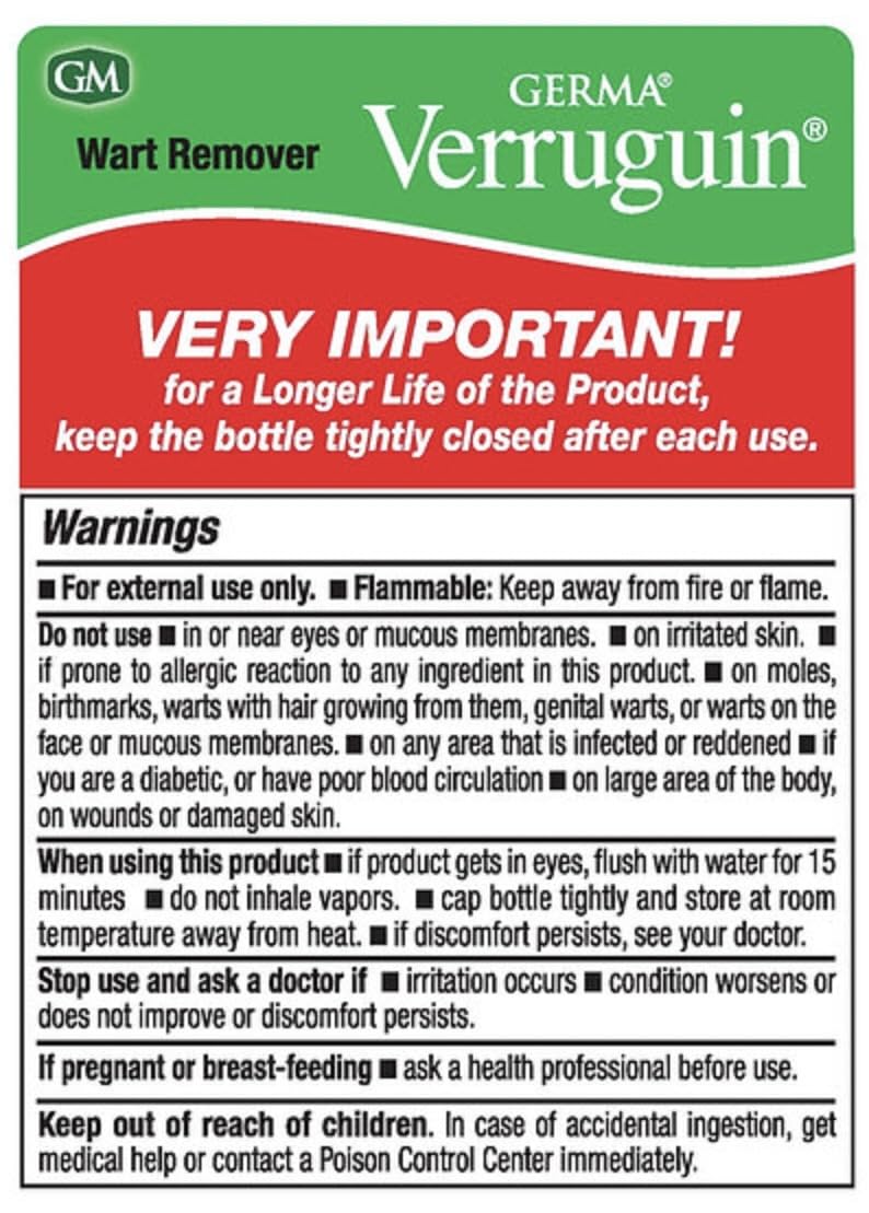 Details: Germa Verrugin Liquid starts working instantly and the results are already seen in 14 days. For external use only. Active Ingredient: Salicylic acid 17%. Inactive Ingredients: Flexible collodion, Isopropyl Alcohol. Packaging may vary